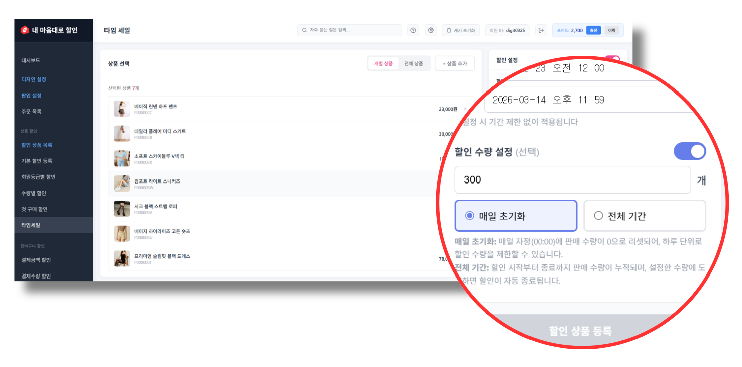 타임세일과 기본 할인 모두에 “할인 수량 설정” 기능이 추가되었습니다.