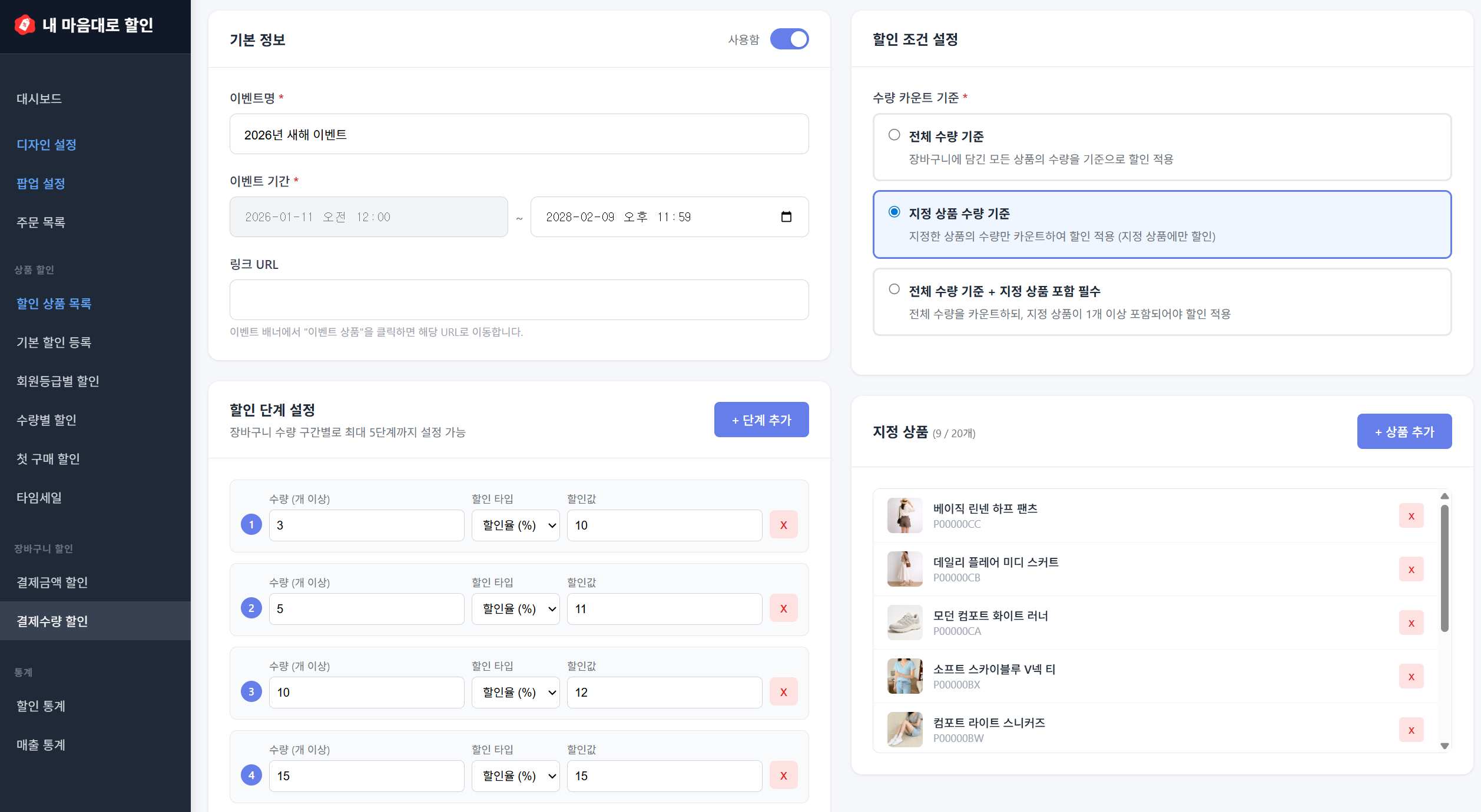 ํ ์ธ์ 1๊ฐ ์ํ์๋ง ์ ์ฉํ ์ง ์ ์ฒด ์ํ์ ์ ์ฉํ ์ง ์ ํํ์ค ์ ์์ต๋๋ค. - ์ ์ฉ ์ํ ์ ํ ๊ธฐ์ค (1๊ฐ ์ํ ์ ์ฉ ์)