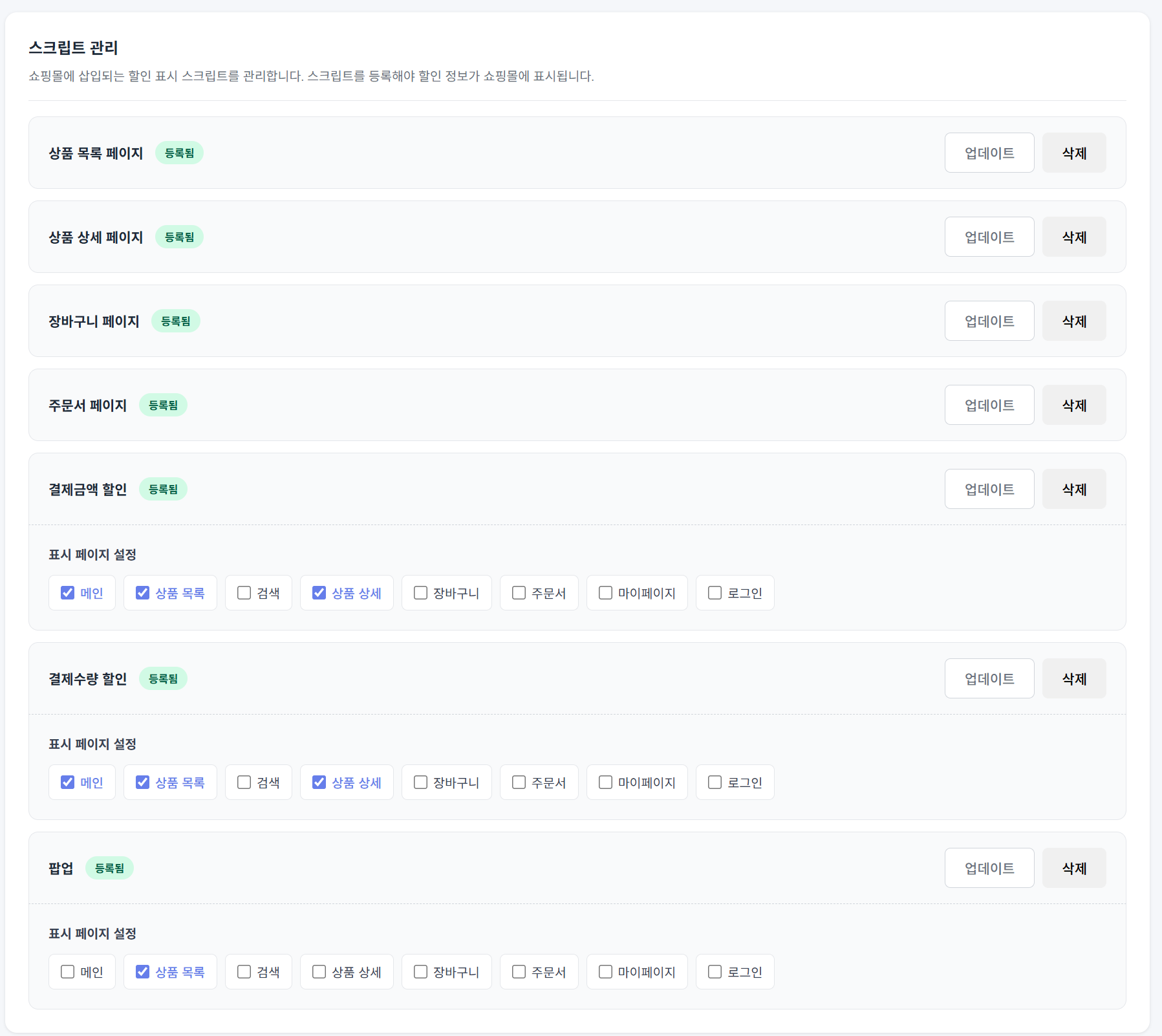๊ฒฐ์ ๊ธ์ก ํ ์ธ ๋ฐ ๊ฒฐ์ ์๋ ํ ์ธ ์คํฌ๋ฆฝํธ์ ํ์ ํ์ด์ง ์ค์ ๊ธฐ๋ฅ์ด ์ถ๊ฐ๋์์ต๋๋ค.